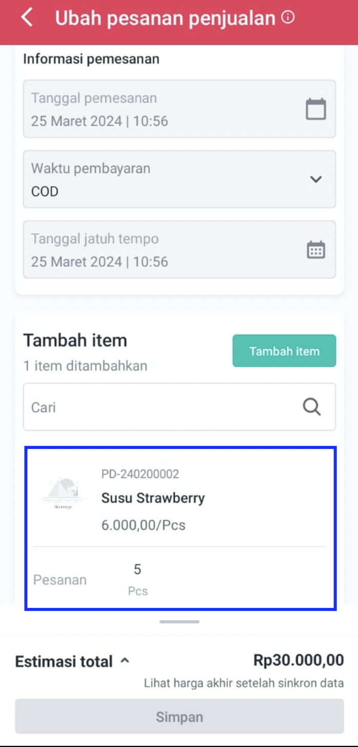 **Step 5.** Ubah pesanan sesuai kebutuhan. Data yang dapat diubah adalah Waktu Pembayaran, Tambah item pesanan atau ganti jumlah kuantitas item yang dipesan sebelumnya.