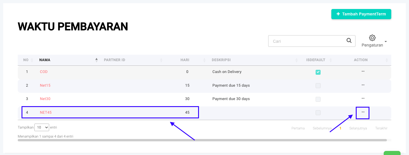 **Step 2.1:** Klik **Nama** pada Waktu Pembayaran yang akan dihapus.