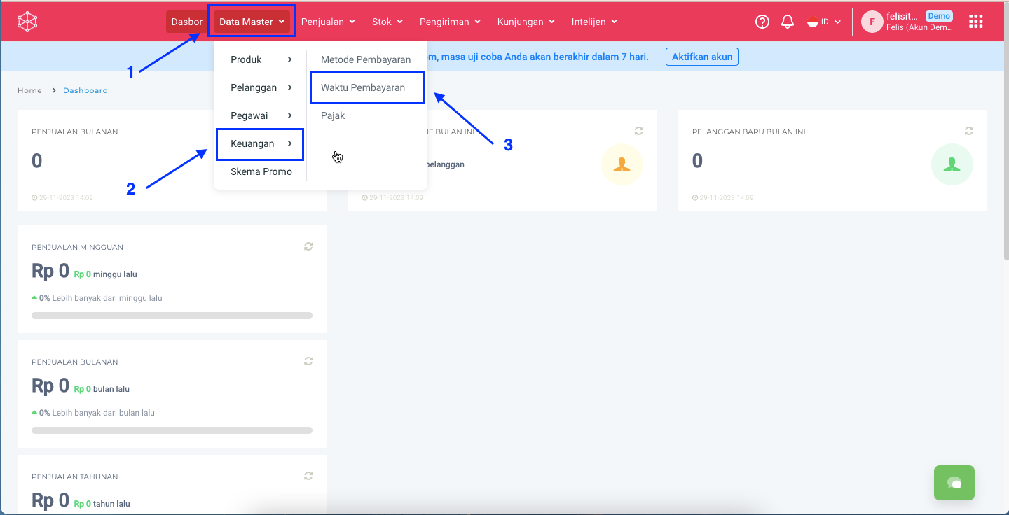 **Step 1:** Masuk ke menu **Data Master > Keuangan** > **Waktu Pembayaran.**