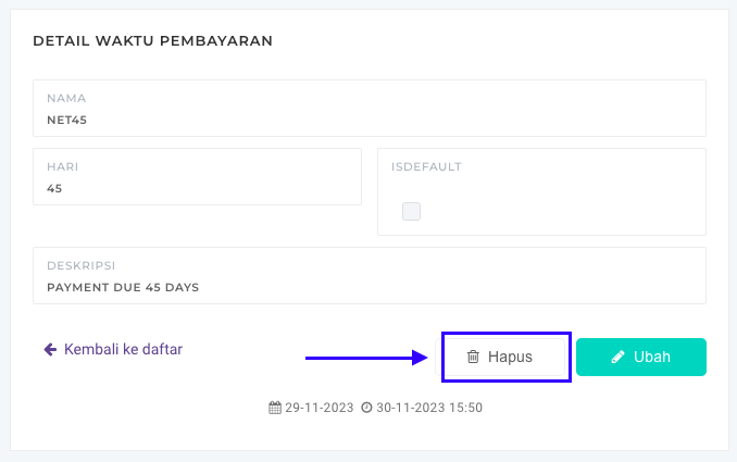 **Step 2:** Untuk menghapus Waktu Pembayaran bisa dengan 2 cara, yaitu melalui **icon** <img src="https://3837174706-files.gitbook.io/~/files/v0/b/gitbook-x-prod.appspot.com/o/spaces%2F-ML6LhsHx5TJpV4GOuvJ%2Fuploads%2FHozE4W0eq224g1I2jlms%2FScreenshot%202023-11-24%20at%2014.15.08.png?alt=media&#x26;token=fabcd796-24ce-4ee8-a72b-4cbd27a55469" alt="" data-size="line"> pada kolom **Action** dan melalui **detail Waktu Pembayaran**.