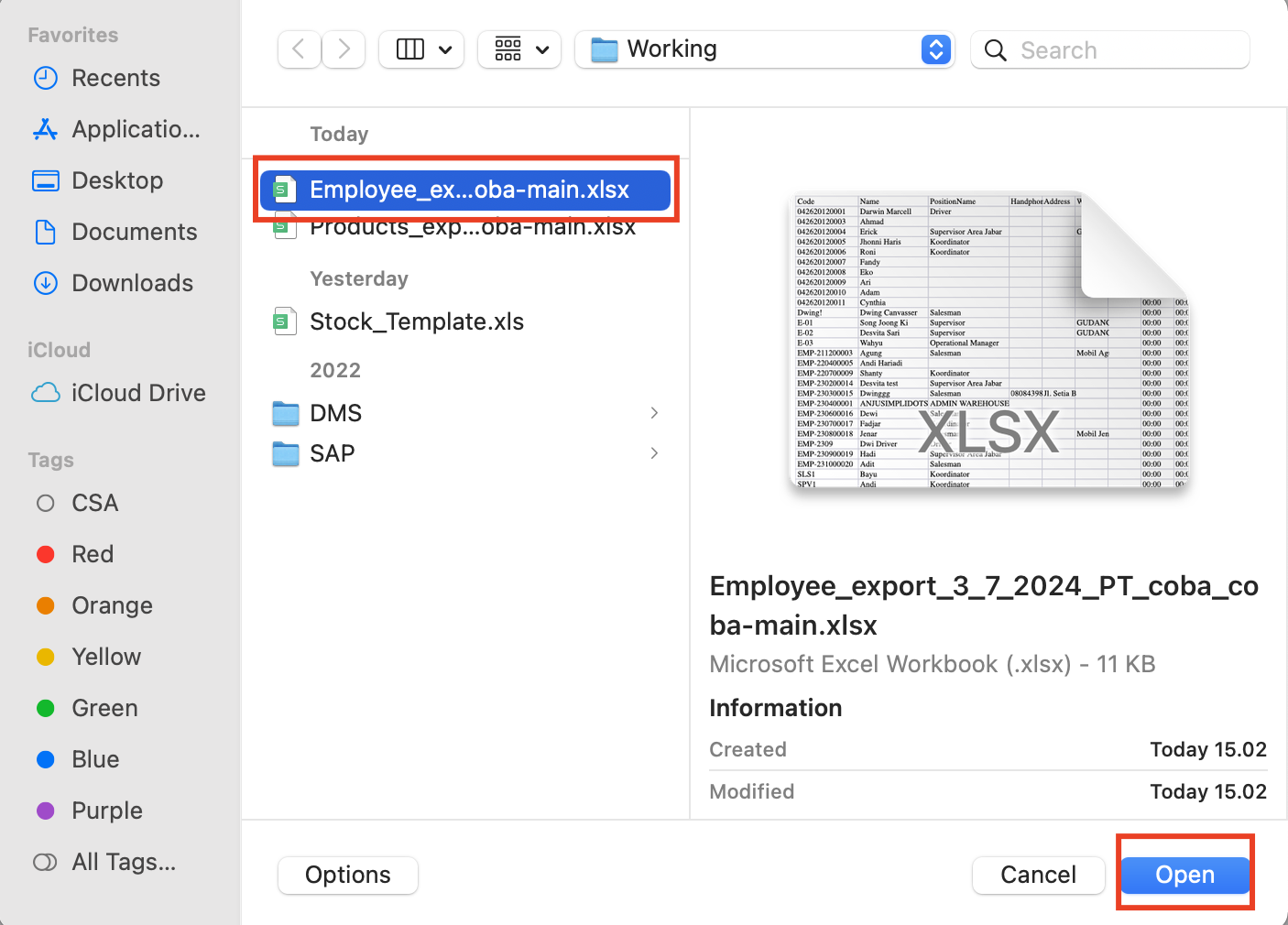 **Step 8**. Pilih file template excel sebelumnya yang telah ter-update datanya dan klik **Open**. &#x20;