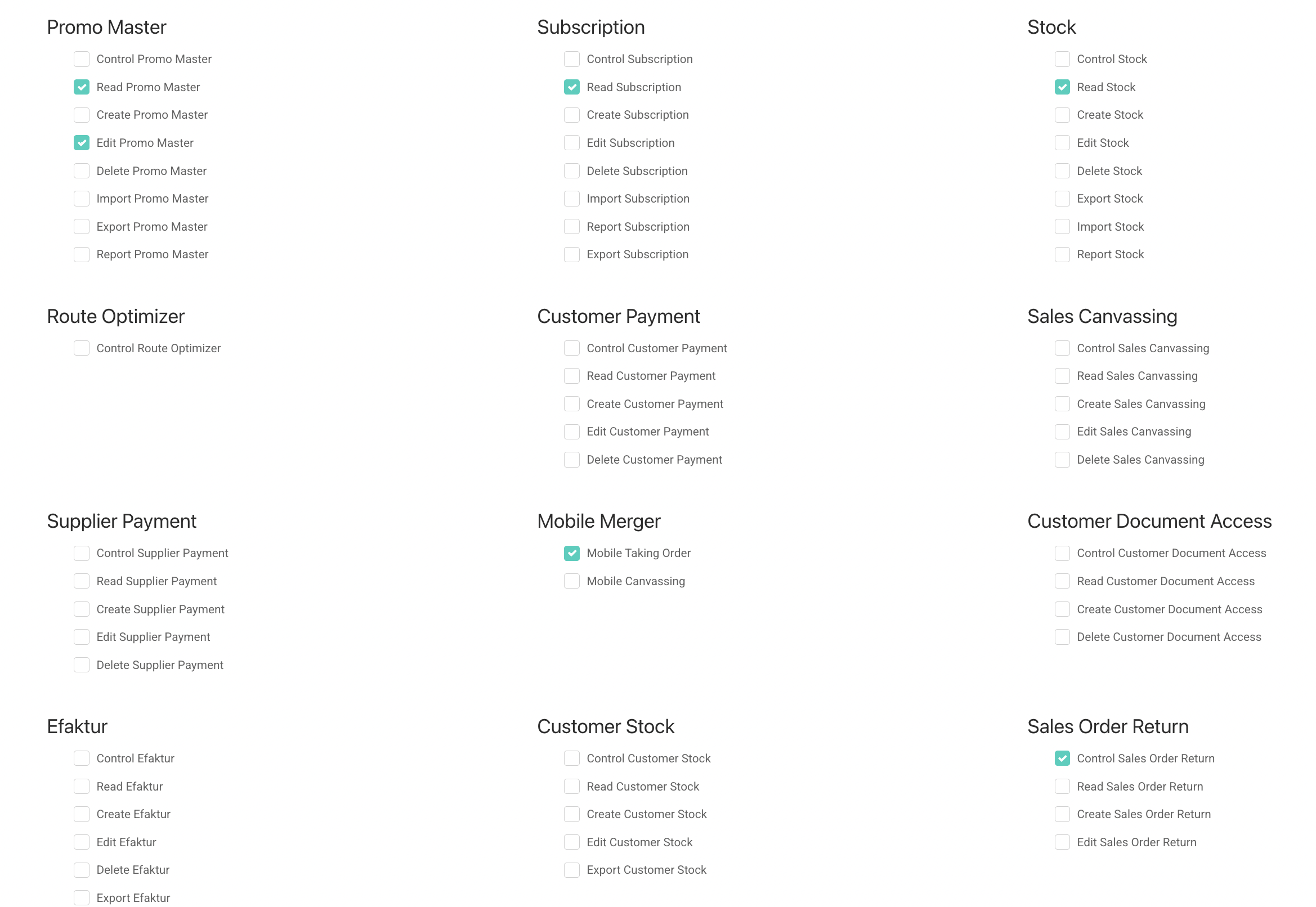 3. Kemudian, checklist **Mobile Taking Order & Mobile Canvassing** pada **Mobile Merger** dan beberapa menu yang wajib lainnya seperti berikut.