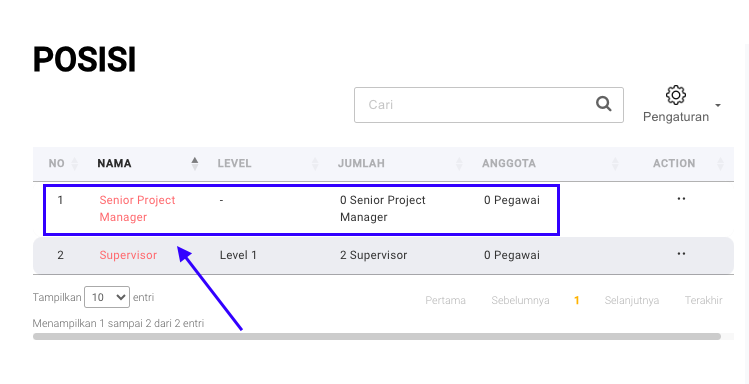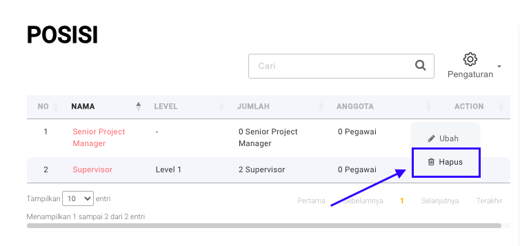 **Step 2.1:** Klik pada icon  ![](https://3837174706-files.gitbook.io/~/files/v0/b/gitbook-x-prod.appspot.com/o/spaces%2F-ML6LhsHx5TJpV4GOuvJ%2Fuploads%2FHozE4W0eq224g1I2jlms%2FScreenshot%202023-11-24%20at%2014.15.08.png?alt=media\&token=fabcd796-24ce-4ee8-a72b-4cbd27a55469) di kolom **Action** pada Posisi yang akan dihapus.