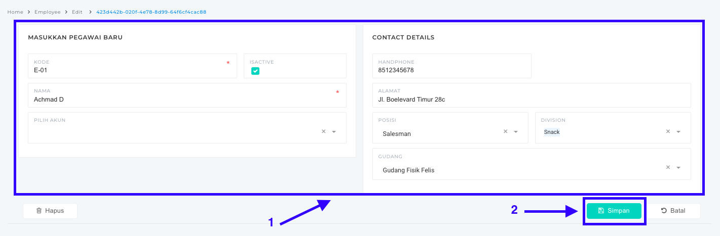 **Step 6:** Silakan ubah data pegawai Anda dengan data yang baru, misalnya mengubah nomor Handphone. Setelah mengubah data silakan pilih **Simpan** untuk menyimpan data pegawai.
