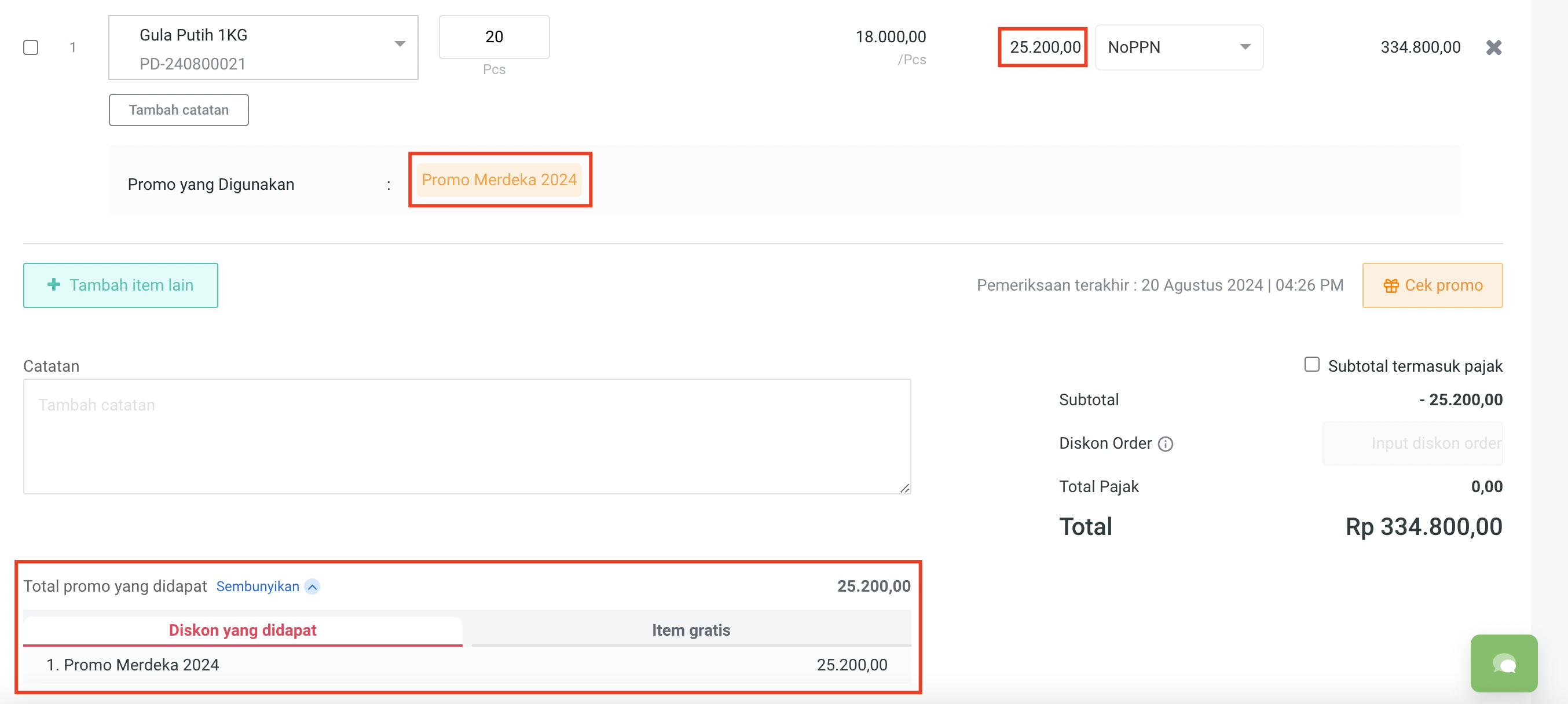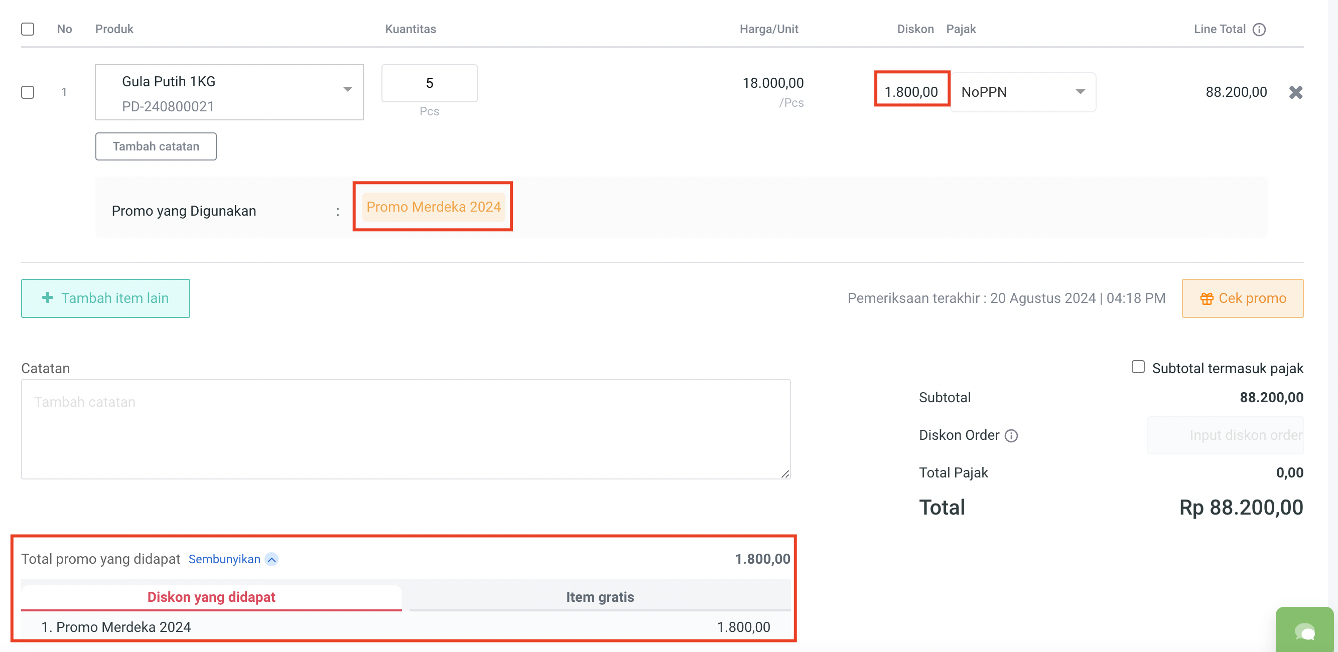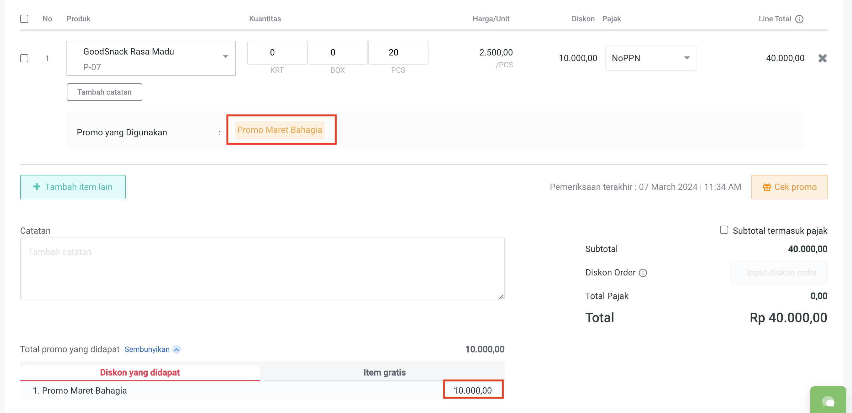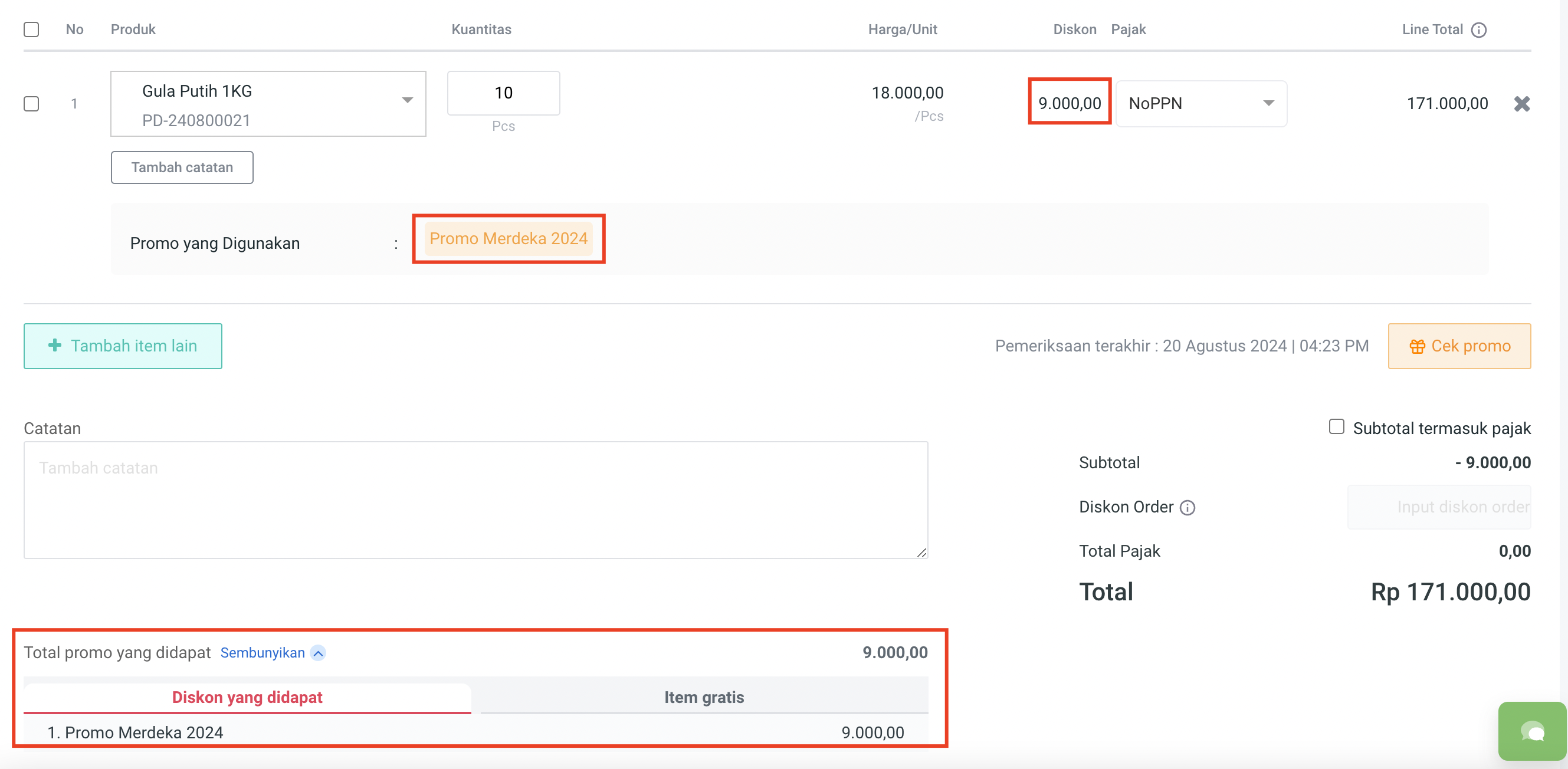 3. Cek total promo yang didapat pada **Diskon yang didapat : 10.000**