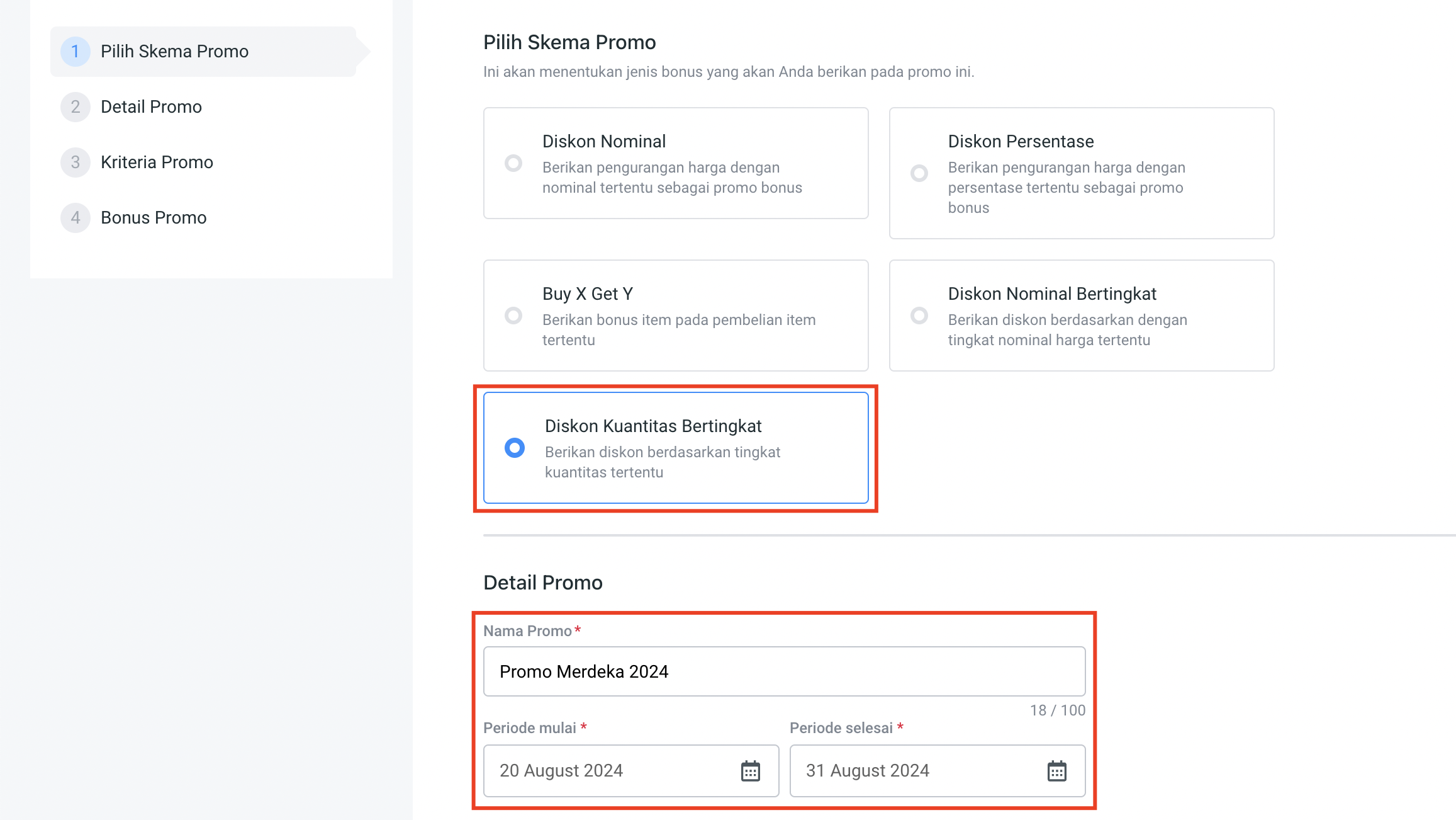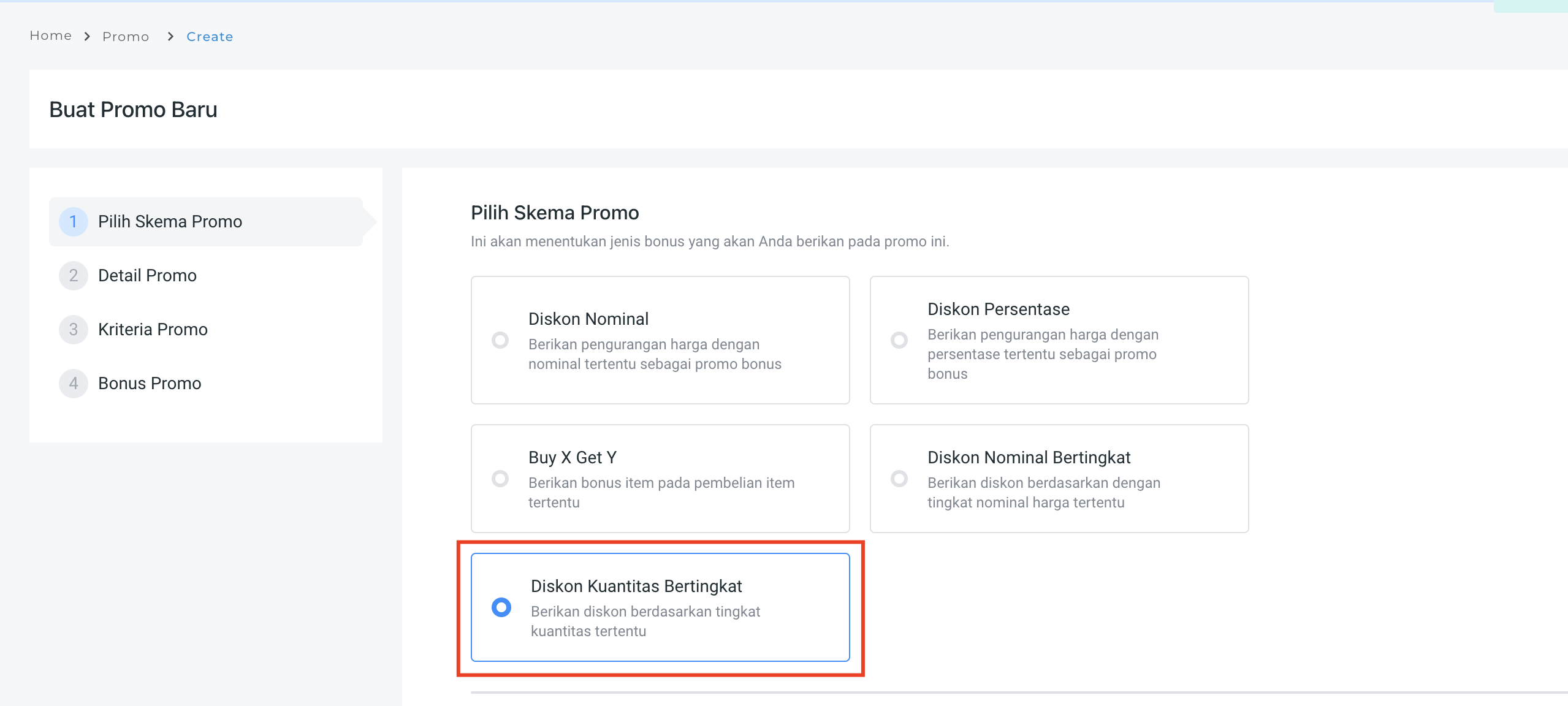 **Step 3:** Pilih **Skema Promo** dan pilih **Diskon Kuantitas Bertingkat.**