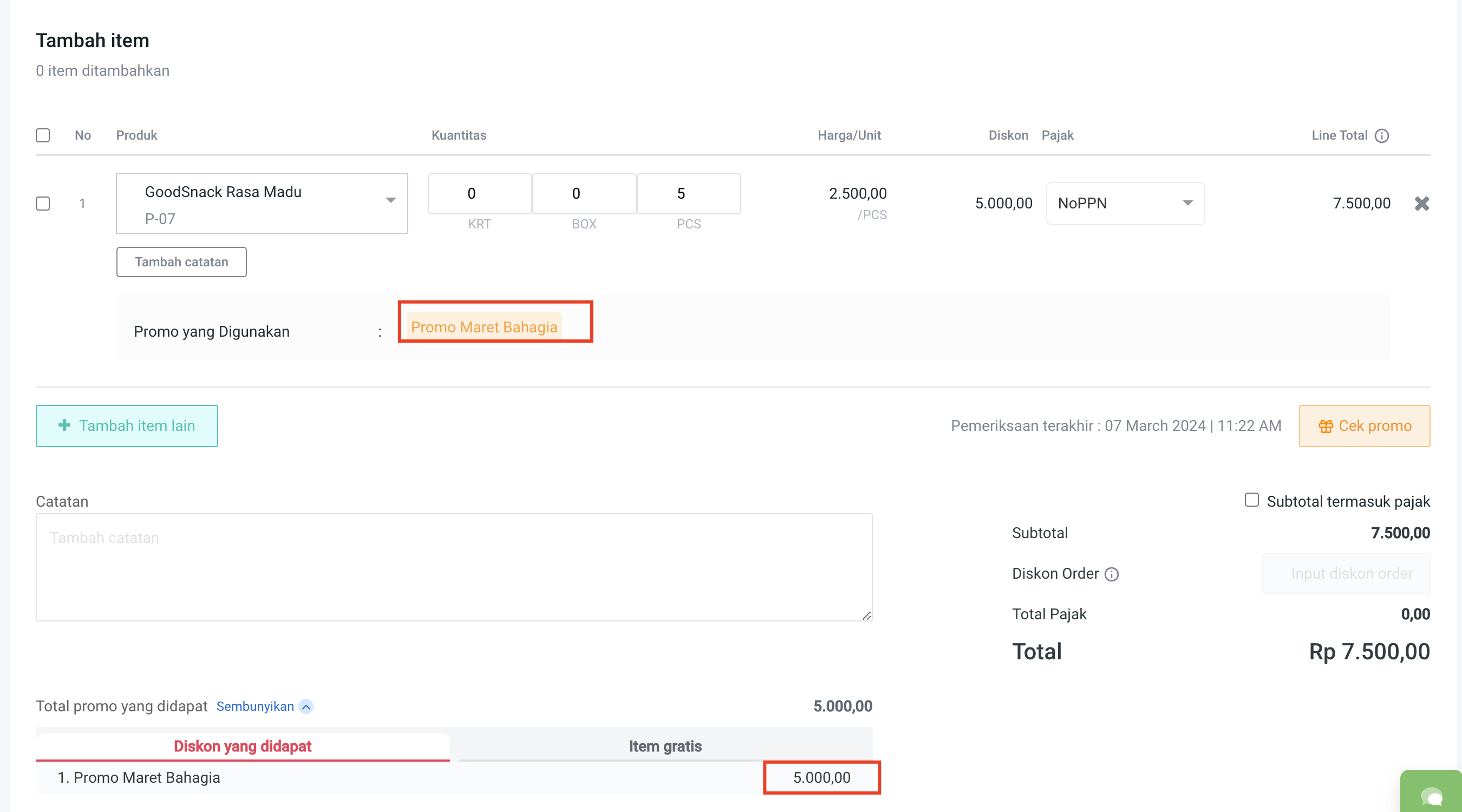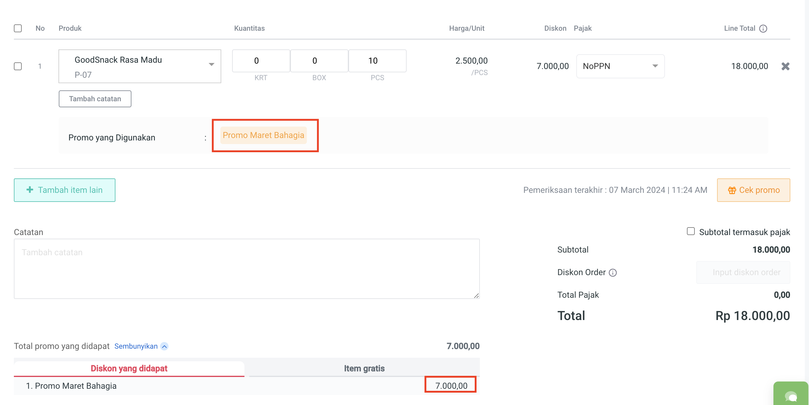 3. Cek total promo yang didapat pada **Diskon yang didapat : 7.000**