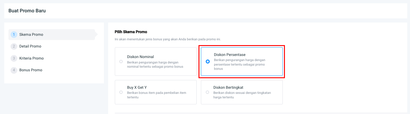 **Step 3:** Selanjutnya, pada bagian skema promo pilih **Diskon Persentase** untuk membuat bonus promo potongan harga dalam bentuk persen (%).