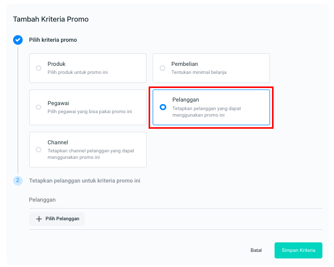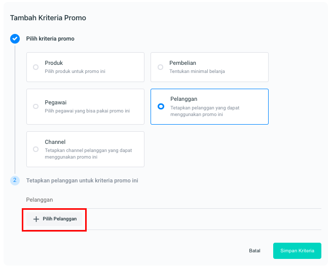 <figure><img src="https://3837174706-files.gitbook.io/~/files/v0/b/gitbook-x-prod.appspot.com/o/spaces%2F-ML6LhsHx5TJpV4GOuvJ%2Fuploads%2FydxYYMCMTyYEV9LMqHrB%2Fimage.png?alt=media&#x26;token=cd56c052-03d5-4497-a268-871e78f72bfd" alt=""><figcaption><p>Tambah Kriteria Promo</p></figcaption></figure>