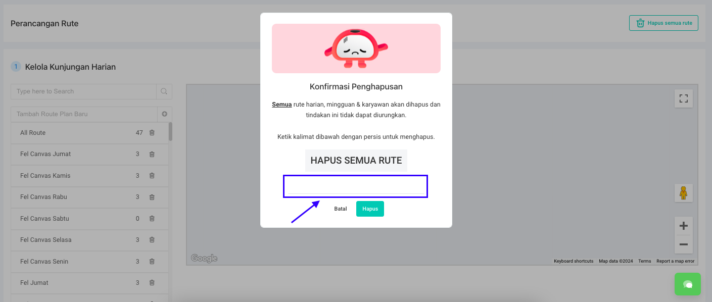 **Step 5:** Setelah mengetikkan **HAPUS SEMUA RUTE**, kemudian klik tombol **Hapus**.