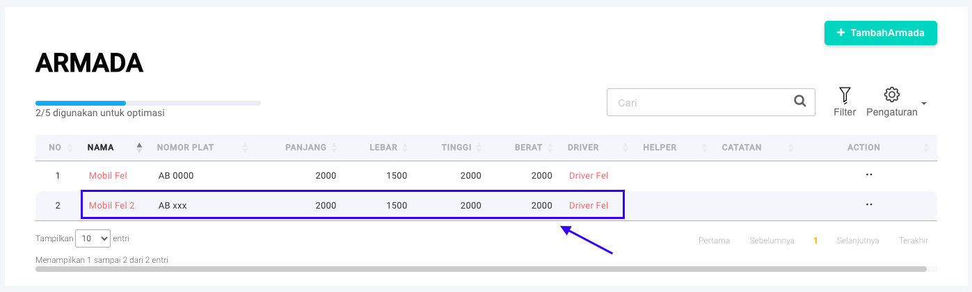 **Step 8: Armada** yang baru saja dibuat akan muncul pada halaman **Armada.**