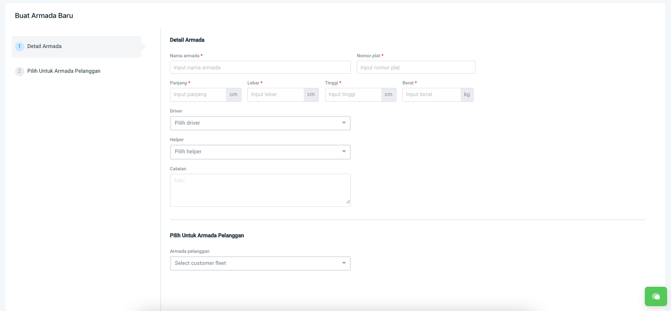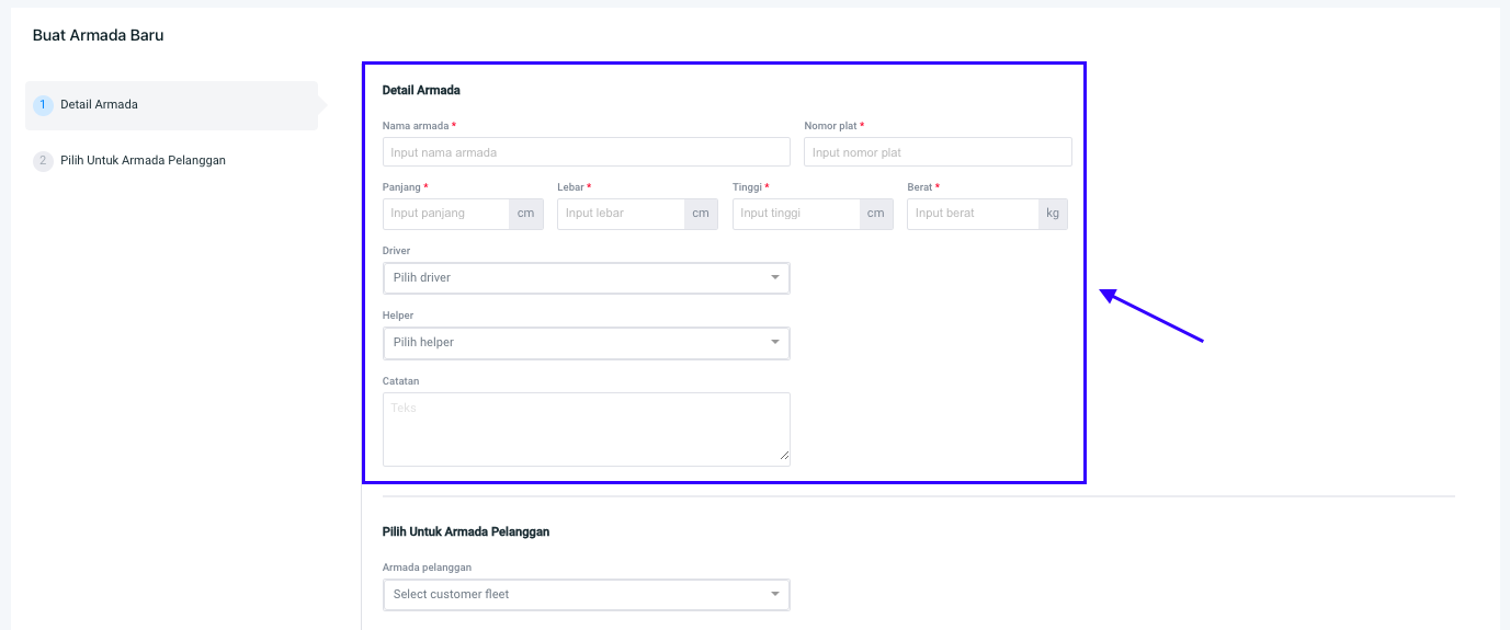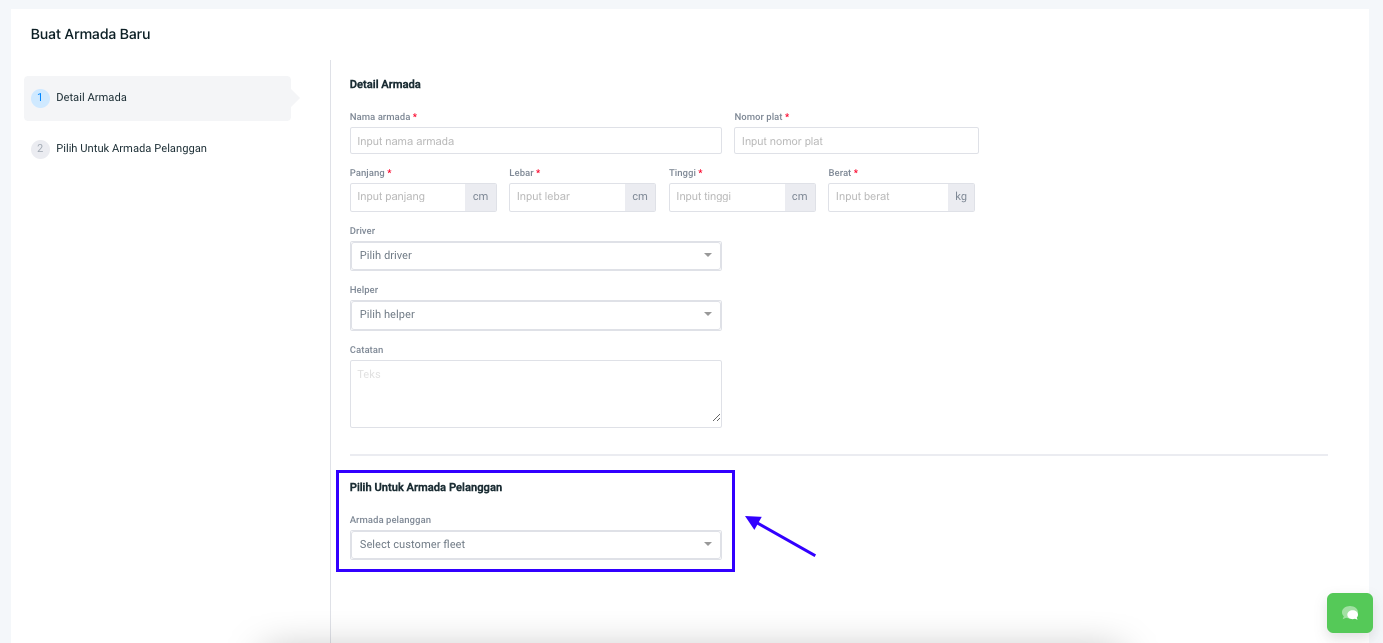 **Step 5:** Silakan isi **Pilih Untuk Armada Pelanggan**.