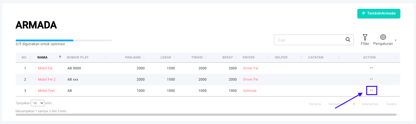**Step 2.1:** Klik pada icon  <img src="https://3837174706-files.gitbook.io/~/files/v0/b/gitbook-x-prod.appspot.com/o/spaces%2F-ML6LhsHx5TJpV4GOuvJ%2Fuploads%2FHozE4W0eq224g1I2jlms%2FScreenshot%202023-11-24%20at%2014.15.08.png?alt=media&#x26;token=fabcd796-24ce-4ee8-a72b-4cbd27a55469" alt="" data-size="line"> di kolom **Action** pada Armada yang akan dihapus.