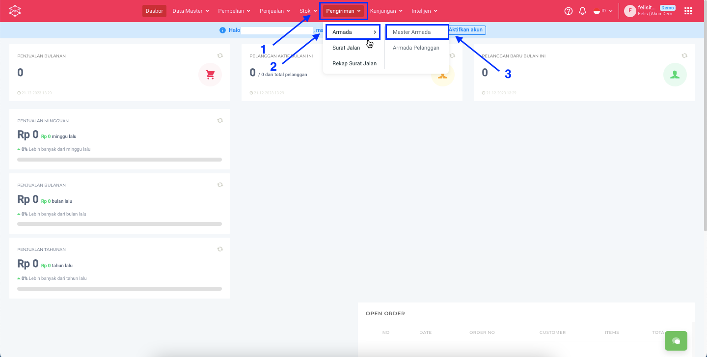**Step 1:** Buka menu **Pengiriman > Armada > Master Armada.**