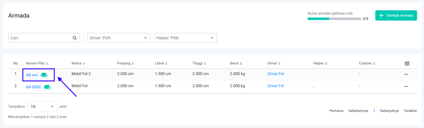 **Step 2.1:** Klik **Nomor Plat** pada Armada yang akan diubah datanya.