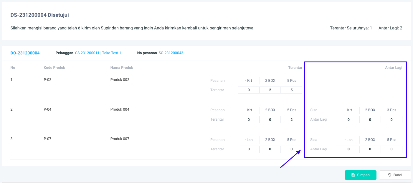 **Step 3:** Silakan masukkan **jumlah produk yang terantar** pada **Terantar** (nomor 1). Apabila ada produk yang tidak dikirim maka pada **Antar Lagi** akan terdapat jumlah stok yang perlu diantar lagi.