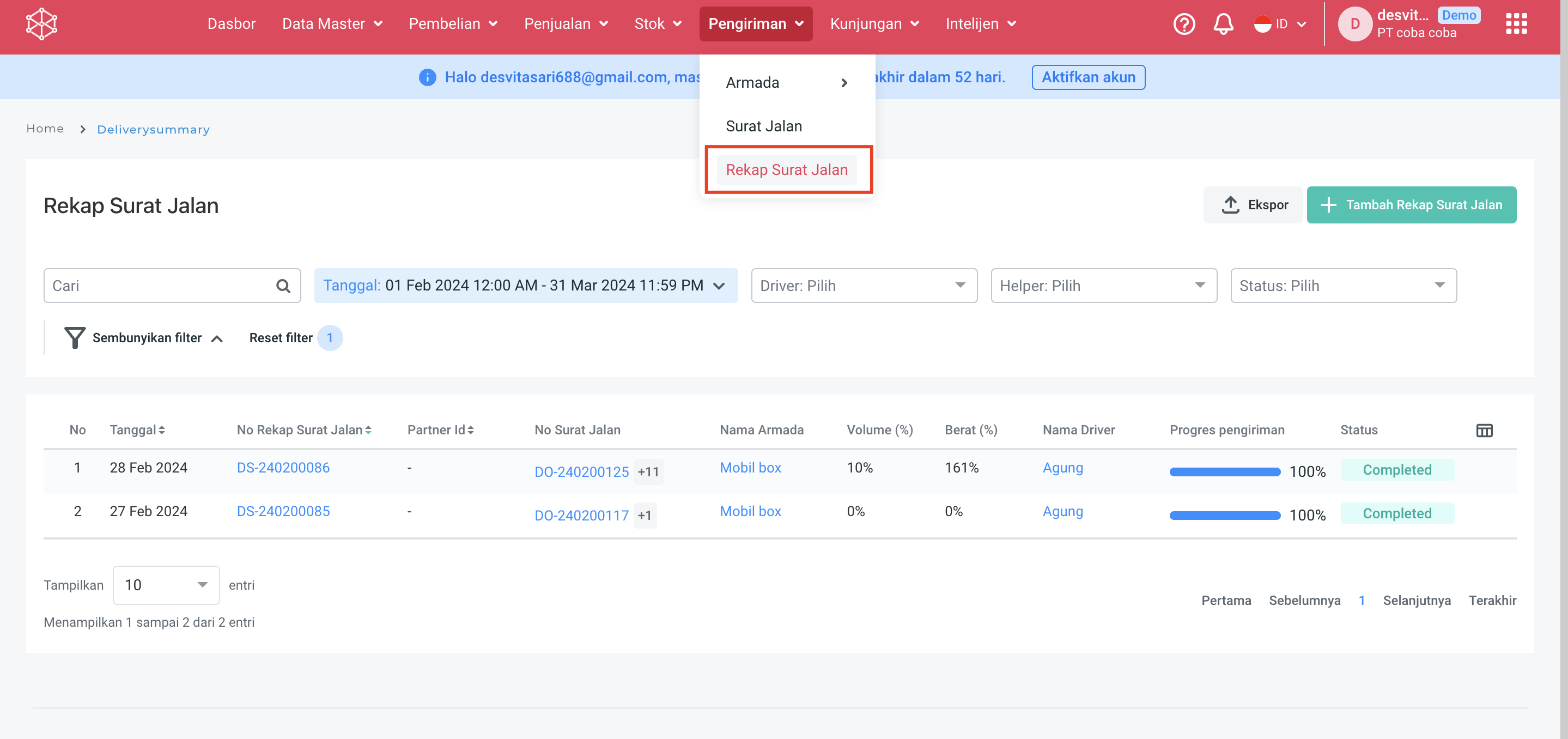 **Step 2:** Lalu pilih menu **Rekap** **Surat Jalan (Delivery Summary (DS)).**