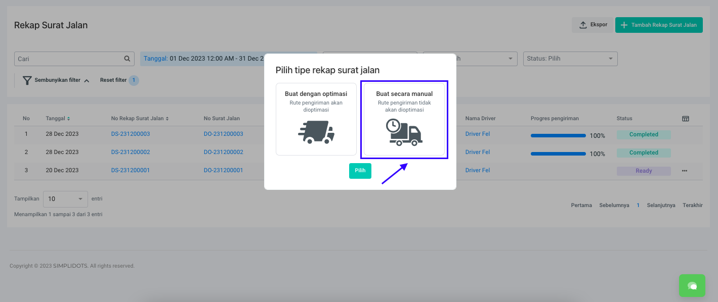 * **Driver:** Diisi nama Driver yang akan melakukan pengiriman.