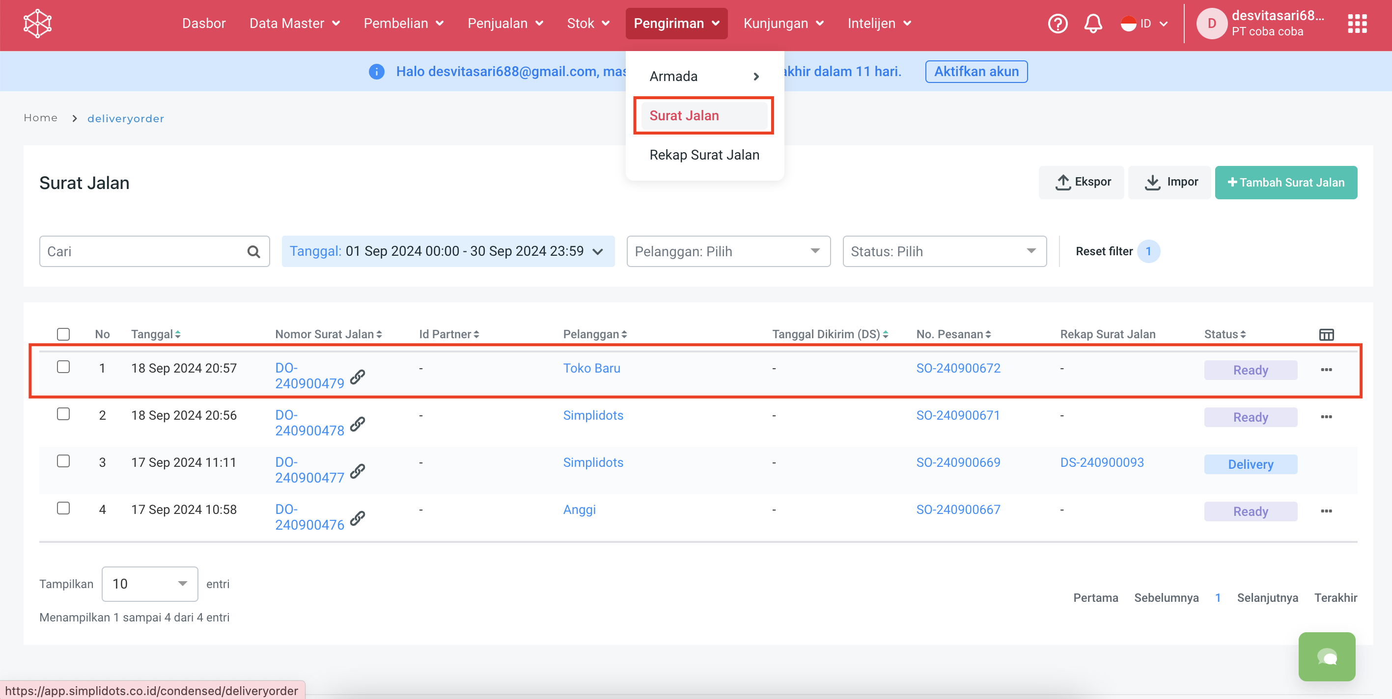 1. Dari halaman daftar Rekap Surat Jalan.\