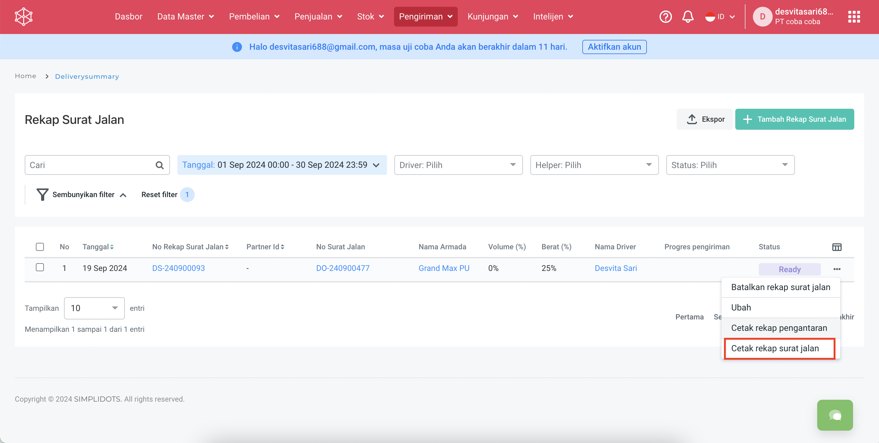 Pilih **Cetak Rekap Surat Jalan** pada action ![](https://3837174706-files.gitbook.io/~/files/v0/b/gitbook-x-prod.appspot.com/o/spaces%2F-ML6LhsHx5TJpV4GOuvJ%2Fuploads%2FWEoy1sjC3U286Qt6o6jY%2Fimage.png?alt=media\&token=93b3cf63-f319-4846-86df-0ff01d260efc).<br>