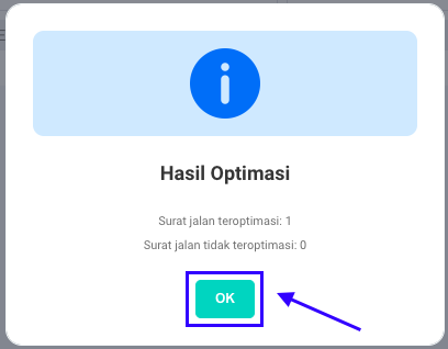 **Step 10:** Akan muncul pop up **Hasil Optimasi** berisi informasi surat jalan yang teroptimasi dan surat jalan yang tidak teroptimasi. Kemudian klik tombol **OK**.
