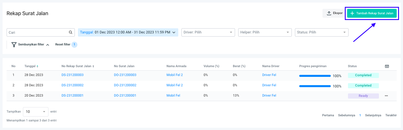 **Step 2:** Klik tombol **+ Tambah Rekap Surat Jalan**.