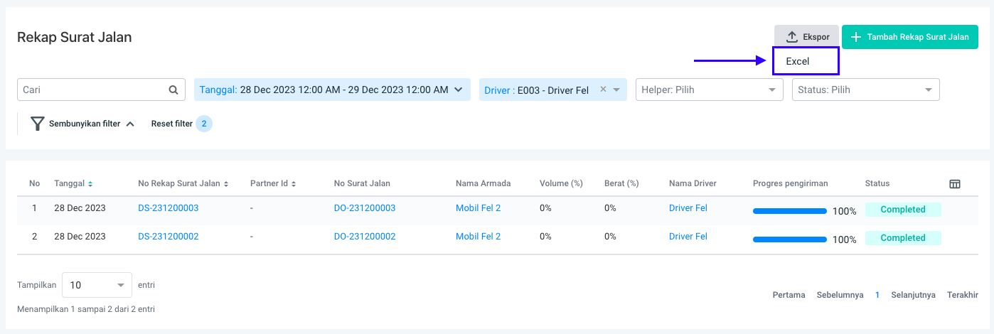 | Status                     | Status rekap surat jalan. Terdiri atas 2 yaitu: Delivering dan Completed. |