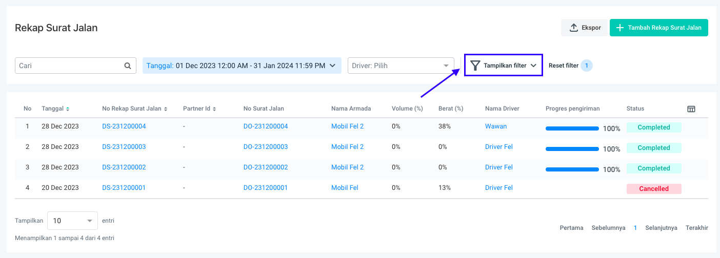 **Step 3:** Pilih ketentuan sesuai dengan yang diinginkan berdasarkan Tanggal (selisih tanggal maksimal adalah 1 hari), Driver, Helper, atau Status.