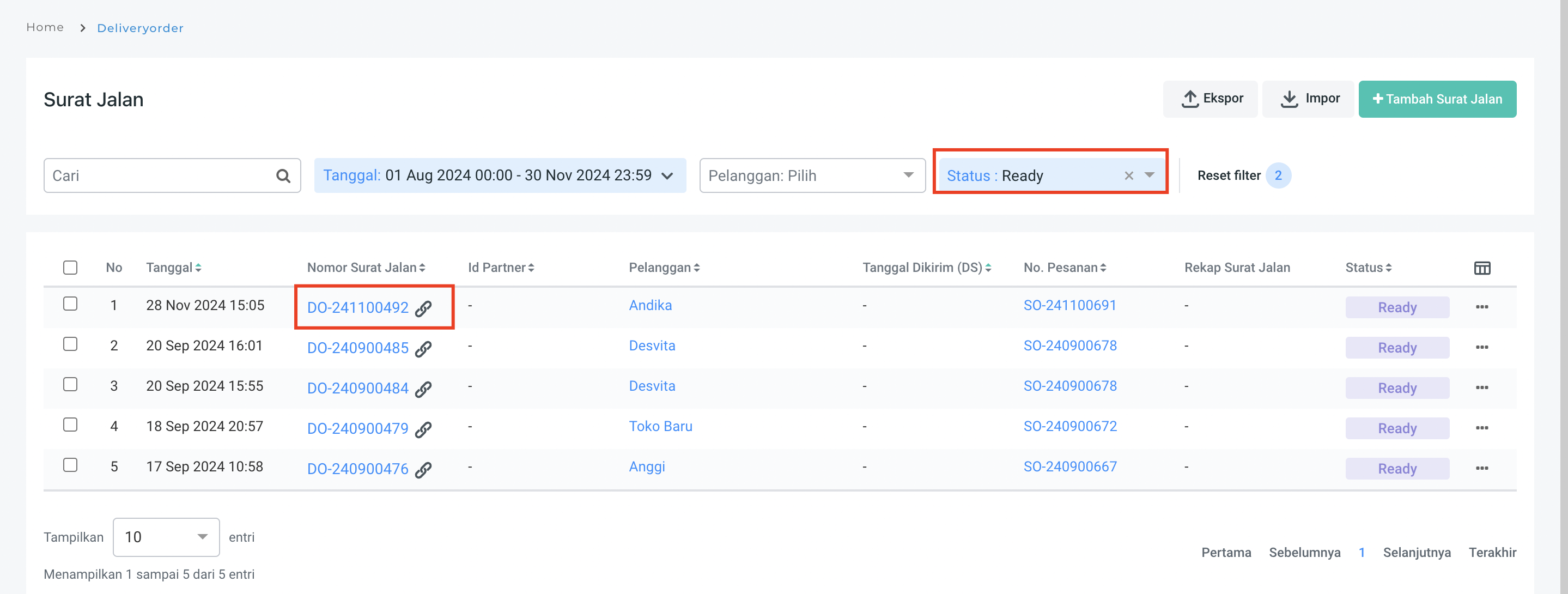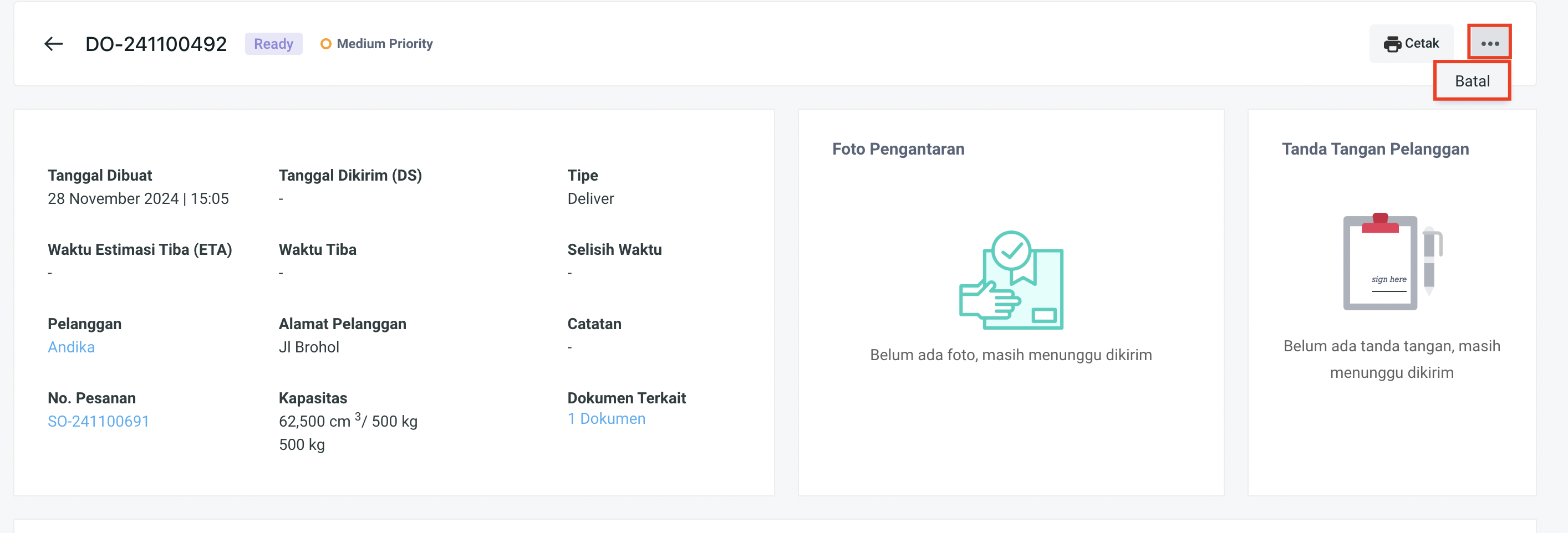 1. Hanya surat jalan berstatus **Ready** dan tidak terikat dengan invoice maupun DS yang dapat dibatalkan.