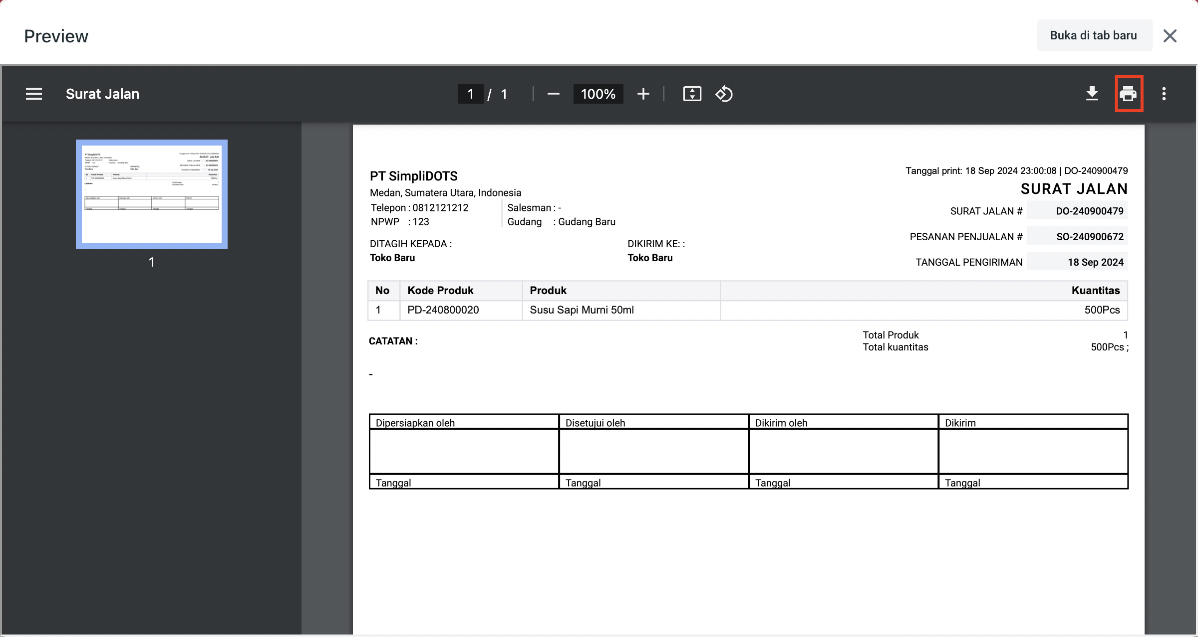**Step 5.** Pilih ikon **Printer** jika ingin langsung dicetak pada tampilan preview dokumen surat jalan.