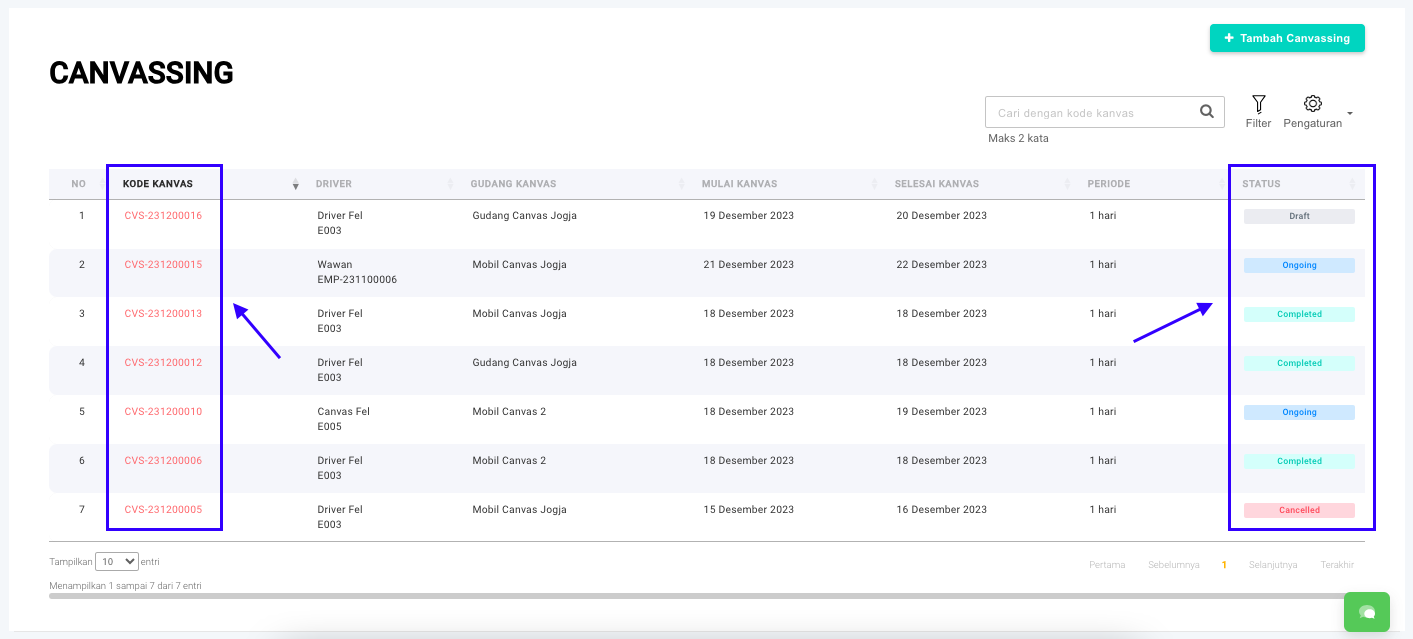 * **Completed:** Status Canvassing sudah selesai atau canvasser sudah kembali ke gudang. Anda telah melakukan **Selesaikan Kanvas.**