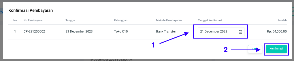 **Step 5:** Selanjutnya, akan muncul informasi terkait **Konfirmasi Pembayaran,** Anda juga bisa sesuaikan tanggal pembayaran dengan atur pada **Tanggal Konfirmasi.** Jika sudah sesuai maka bisa klik tombol **Konfirmasi.**&#x20;