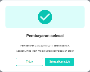 **Step 6:** Akan muncul pop up **Pembayaran Selesai,** klik tombol **Selesaikan Stok.**