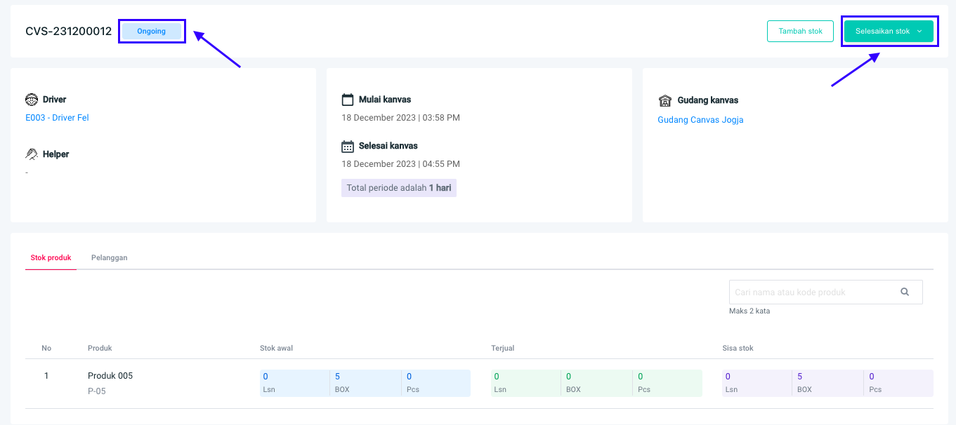 * **Completed:** Status Canvassing sudah selesai atau canvasser sudah kembali ke gudang. Anda telah melakukan **Selesaikan Kanvas.**