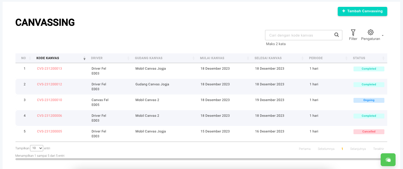 **Step 4:** Anda dapat memfilter berdasarkan **Tanggal Canvassing, Driver, Warehouse, dan Status**.