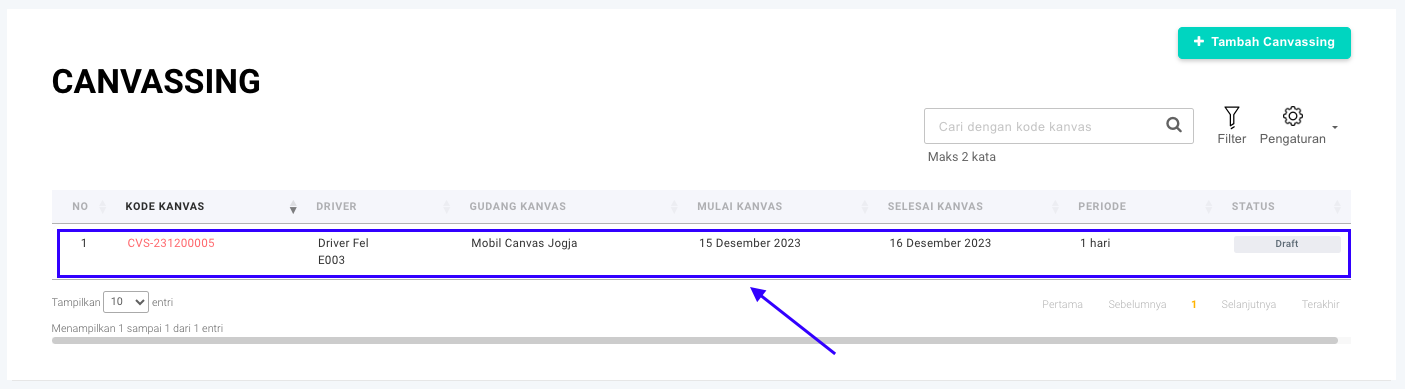 **Step 6:** Setelah berhasil membuat Canvas Baru, maka Canvas yang baru saja dibuat akan muncul pada halaman **Canvassing** dengan status **Draft.**