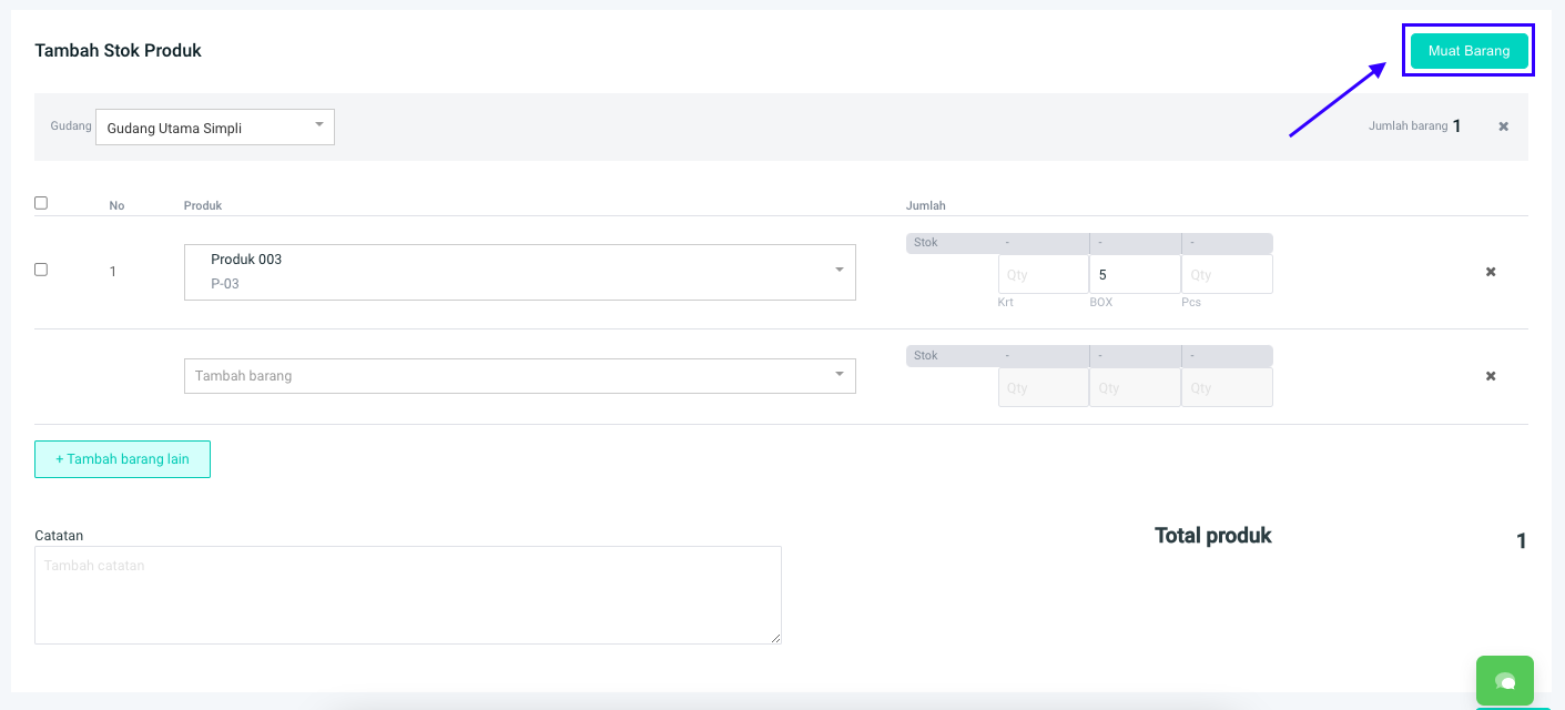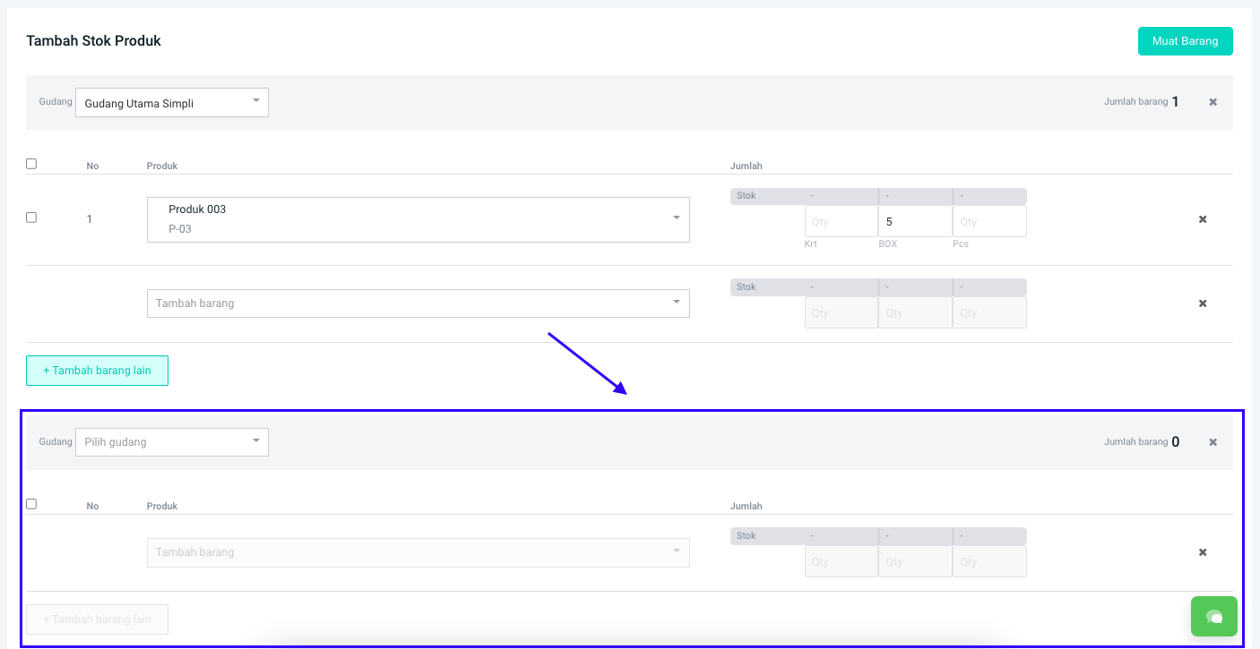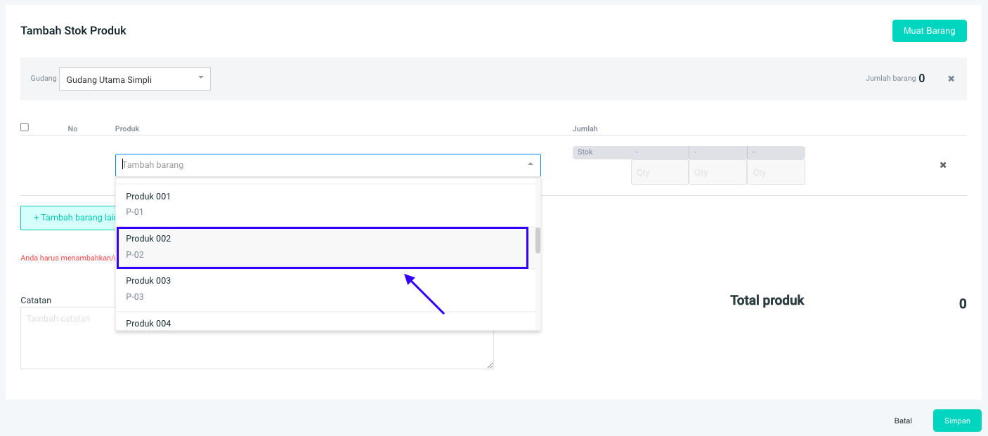 **Step 7:** Akan muncul menu pada **Tambah Stok Produk** untuk memasukkan produk dari gudang lain.