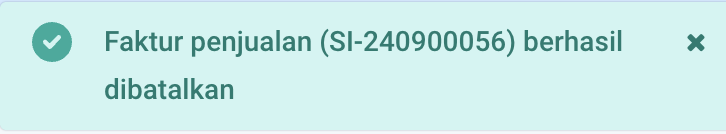 Faktur berhasil dibatalkan jika muncul pop up notifikasi "**Faktur penjualan (SI-xxxxxxxxxx) berhasil dibatalkan"** dan **Status Faktur** berubah dari **Active** menjadi **Cancelled**.
