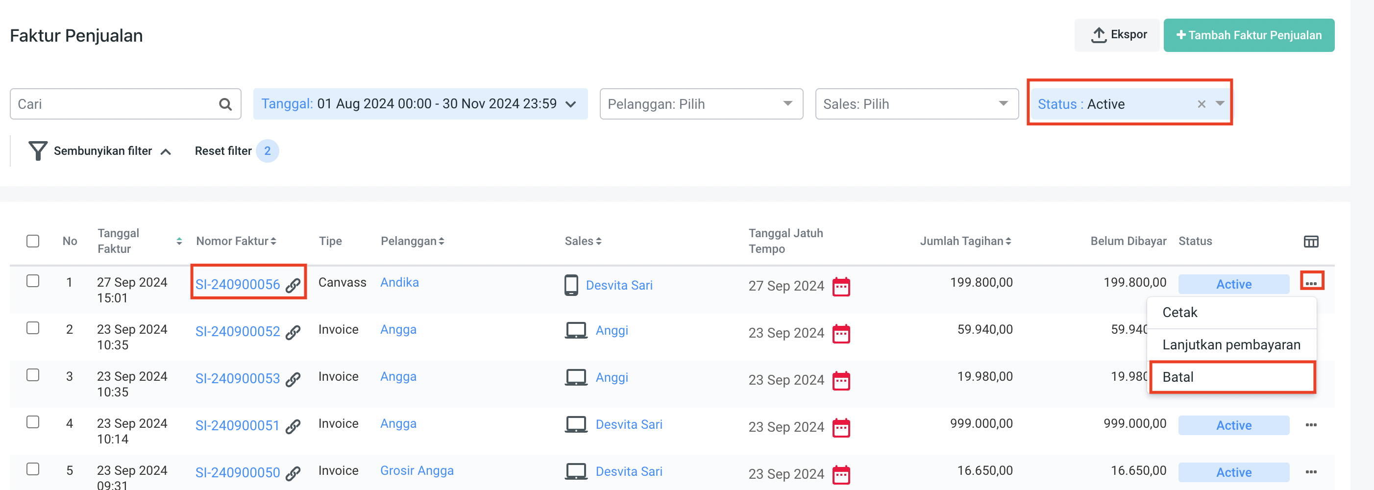 **Step 2.** Pilih nomor **Faktur Penjualan d**engan status **Active** yang akan dibatalkan.
