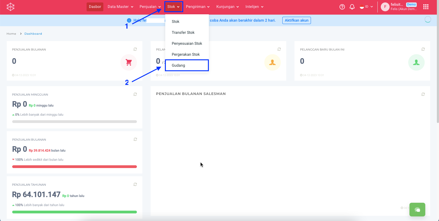 **Step 1:** Masuk ke menu **Stok >  Gudang.**