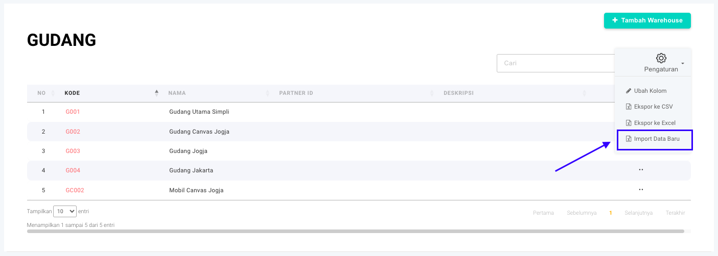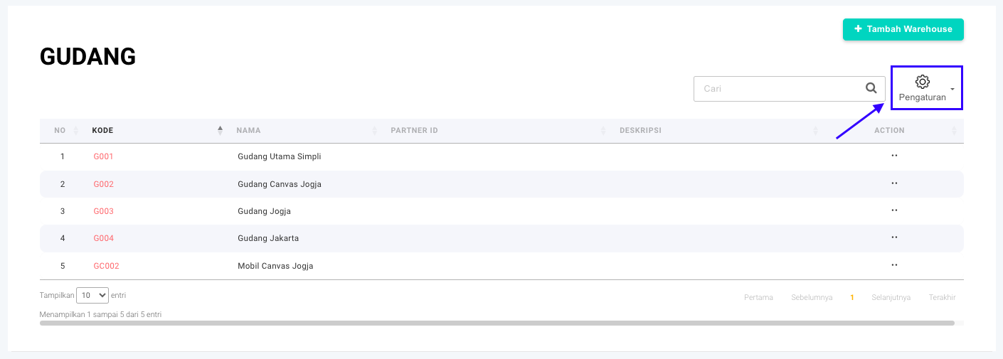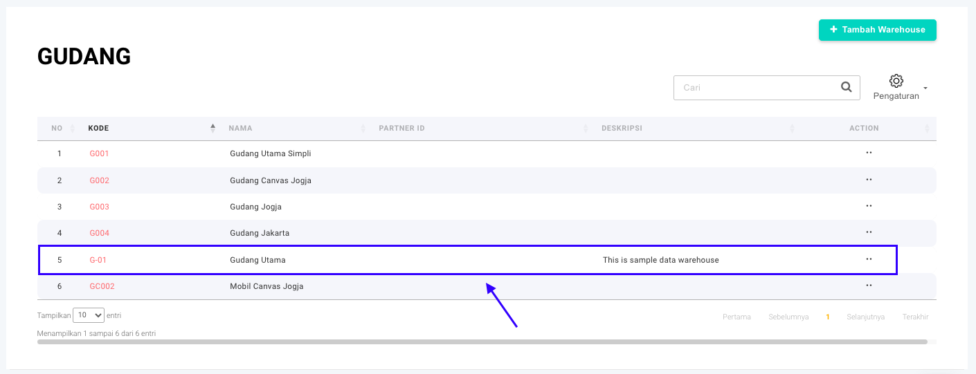 **Step 7:** Data yang tersimpan akan muncul di halaman **Gudang**.Gudang yang telah dibuat akan muncul di tabel **Gudang**.