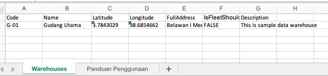 **Step 5:**  Setelah file terunduh (nama file: Template Warehouse - SimpliDOTS.xlsx), silakan isi data sesuai dengan format kolom yang telah disediakan: